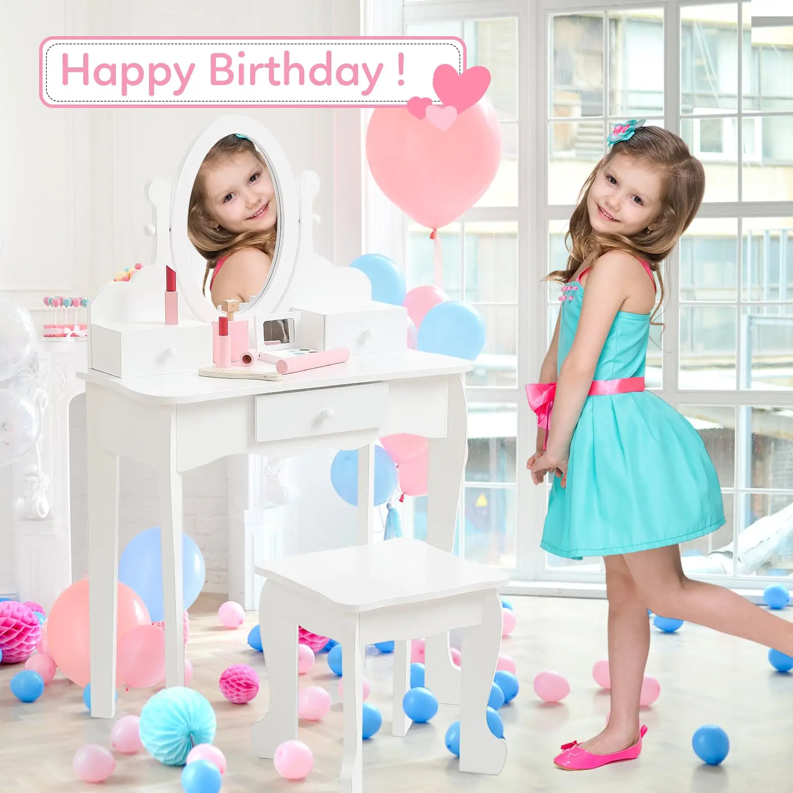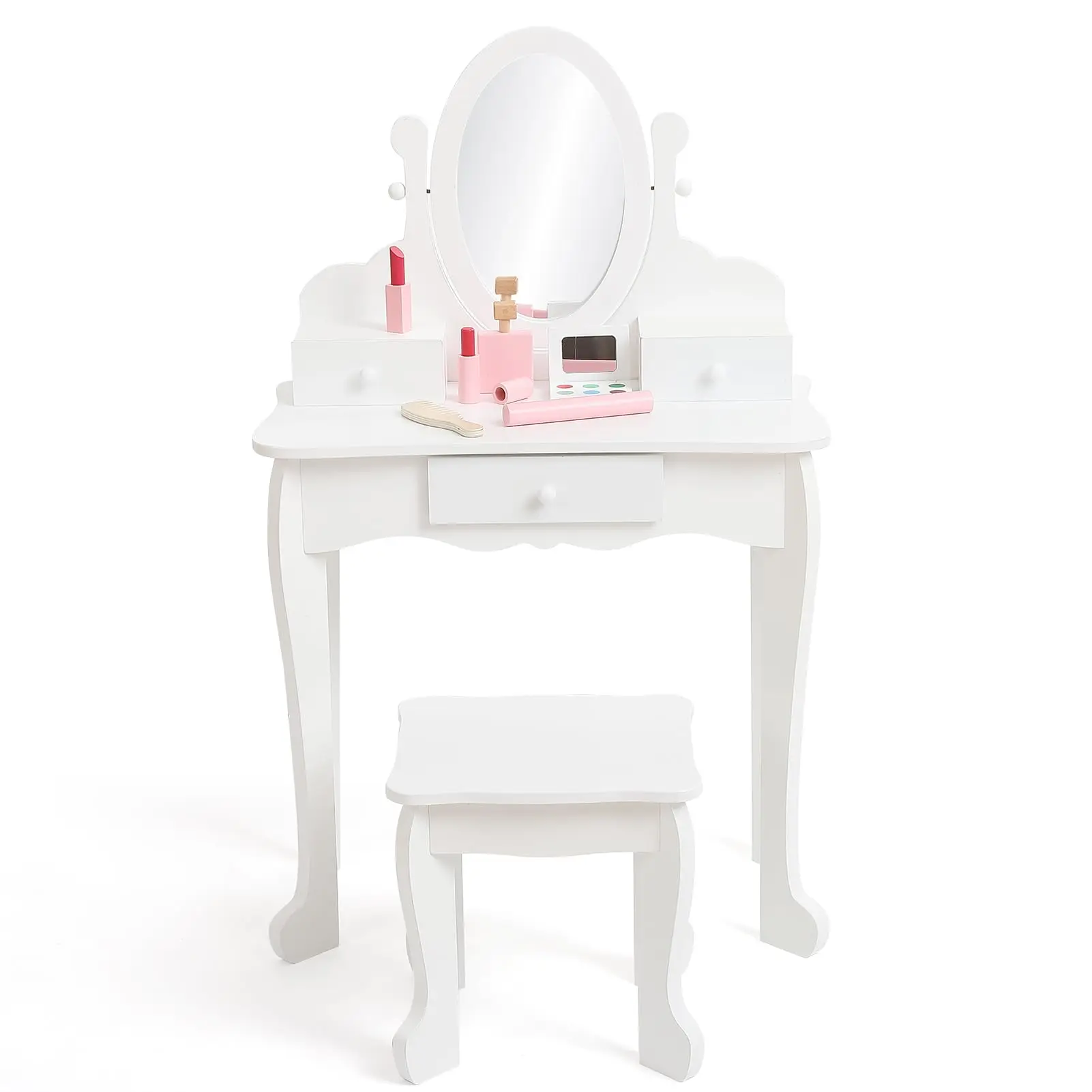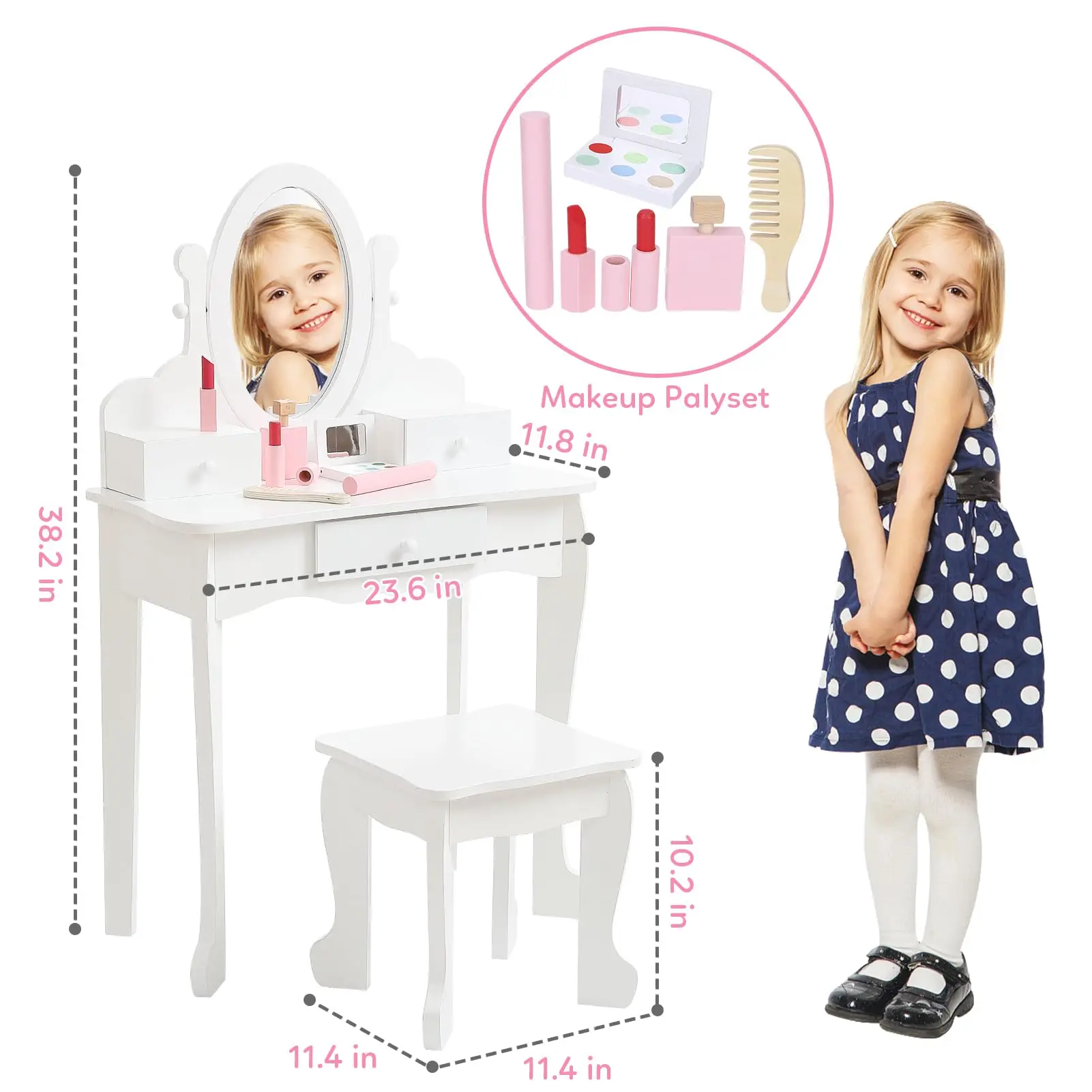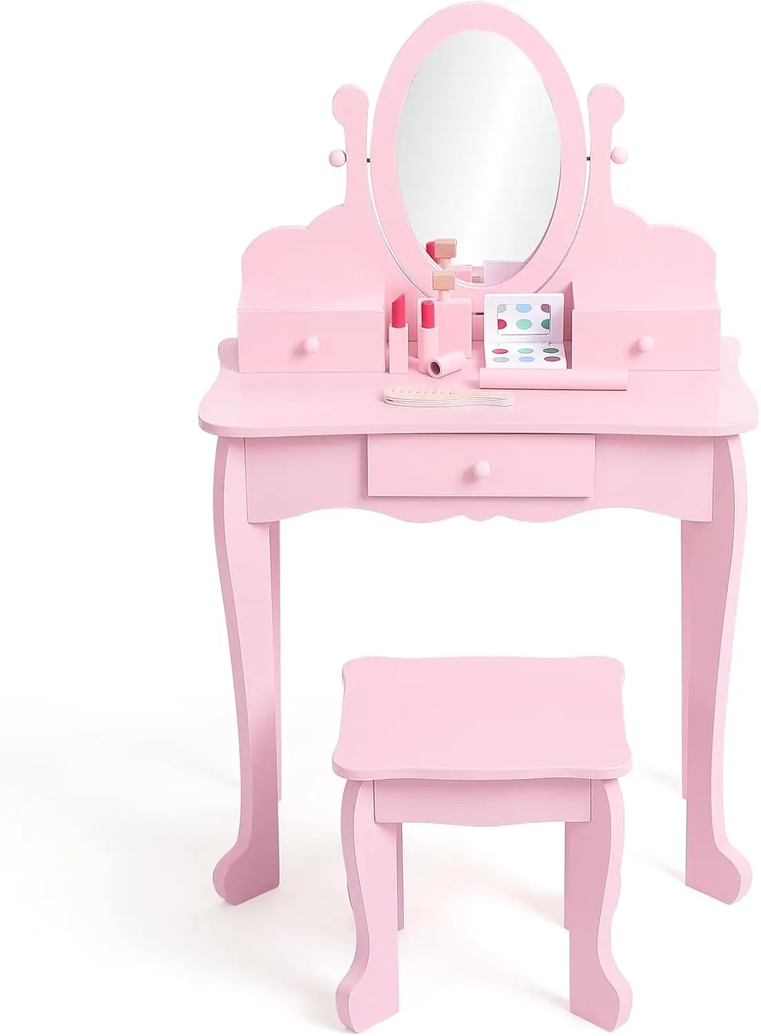 Kids Vanity Set with Mirror and Drawer - Pretend Play Dress-Up Fun with Wooden Makeup Playset for Girls 4-9 Yrs