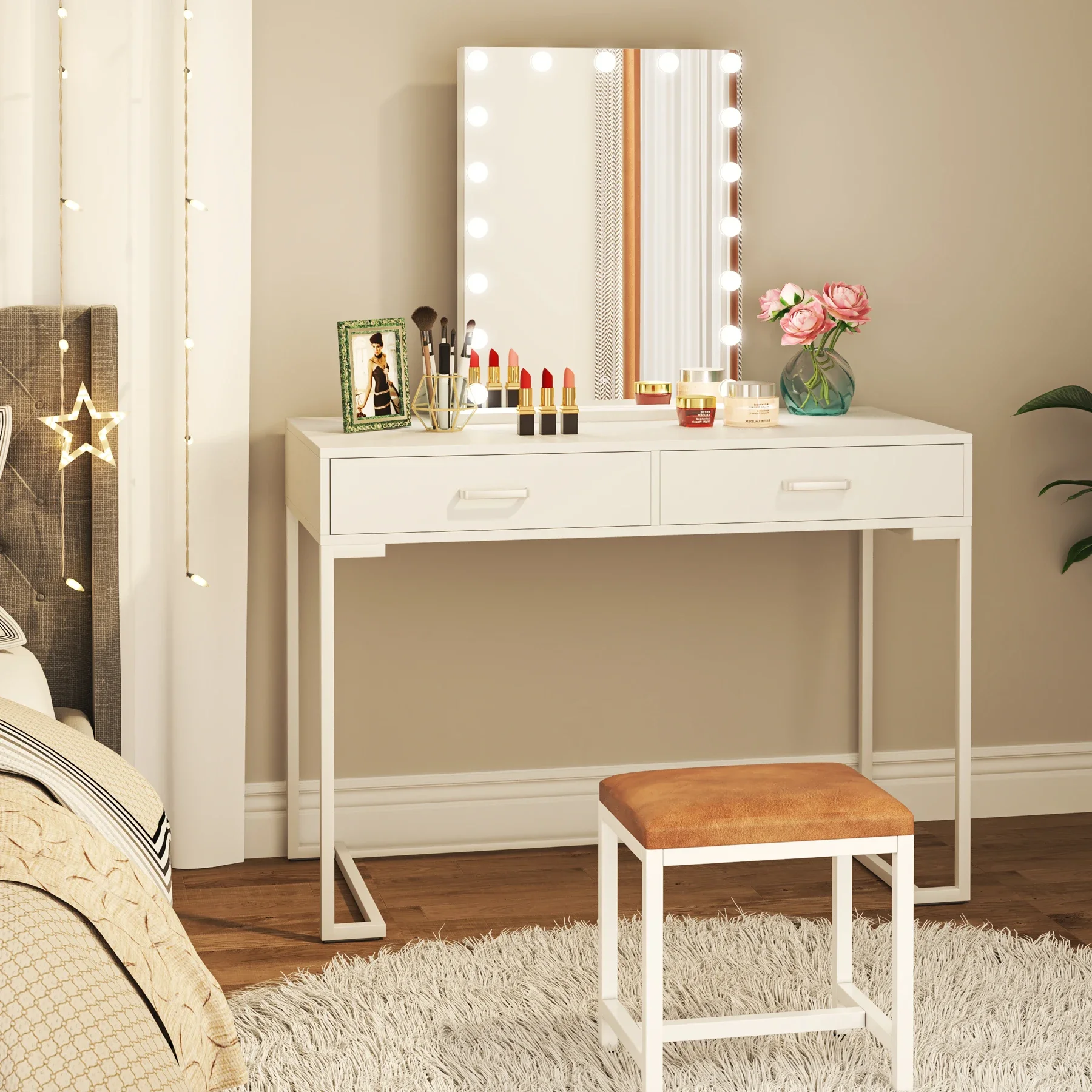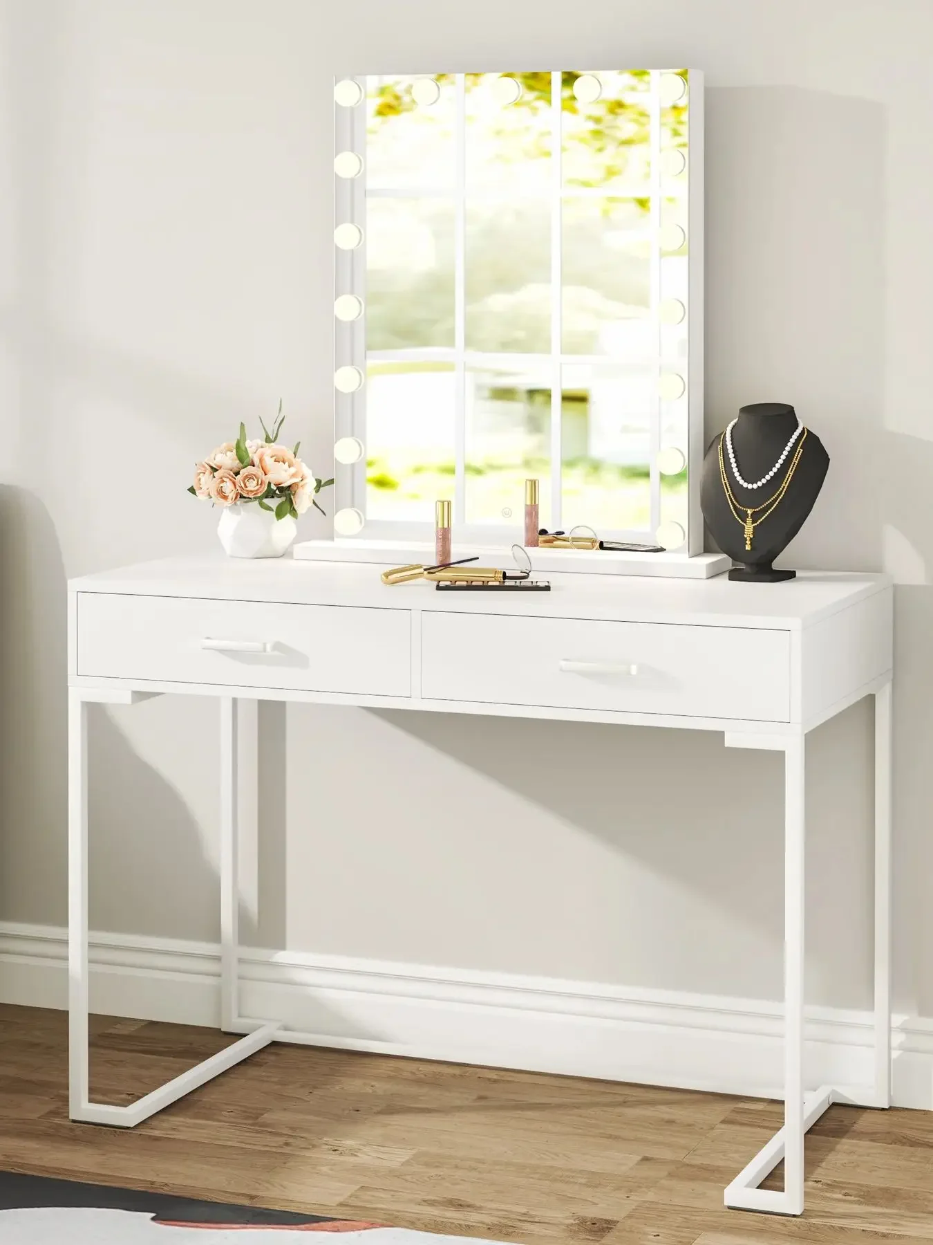 【2 WIDE DRAWERS】: 20" in length and 3.1" in depth, provide you with private room to hold your notebooks, papers, files, documents, and other office supplies or makeup stuffs. Paired with golden handles for easy access.