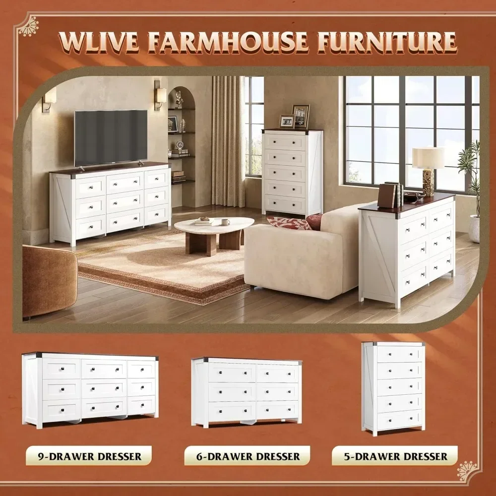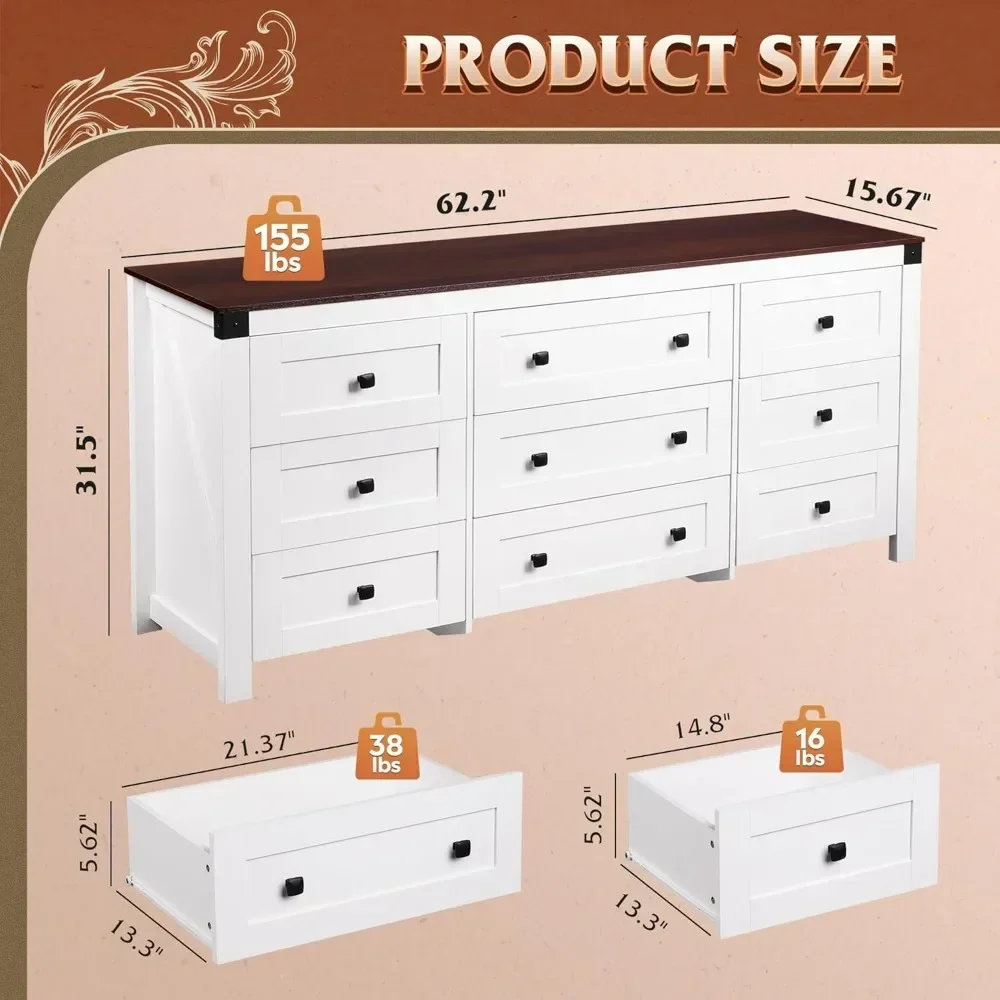 【Farmhouse 9 Drawers Dresser】This wooden dresser features a white with a brown wood top, retro square handle adds a rustic charm, simple design exudes warmth and comfort, can be used for bedroom clothing organizer, entryway table, decorative storage for living room.