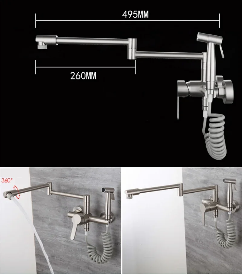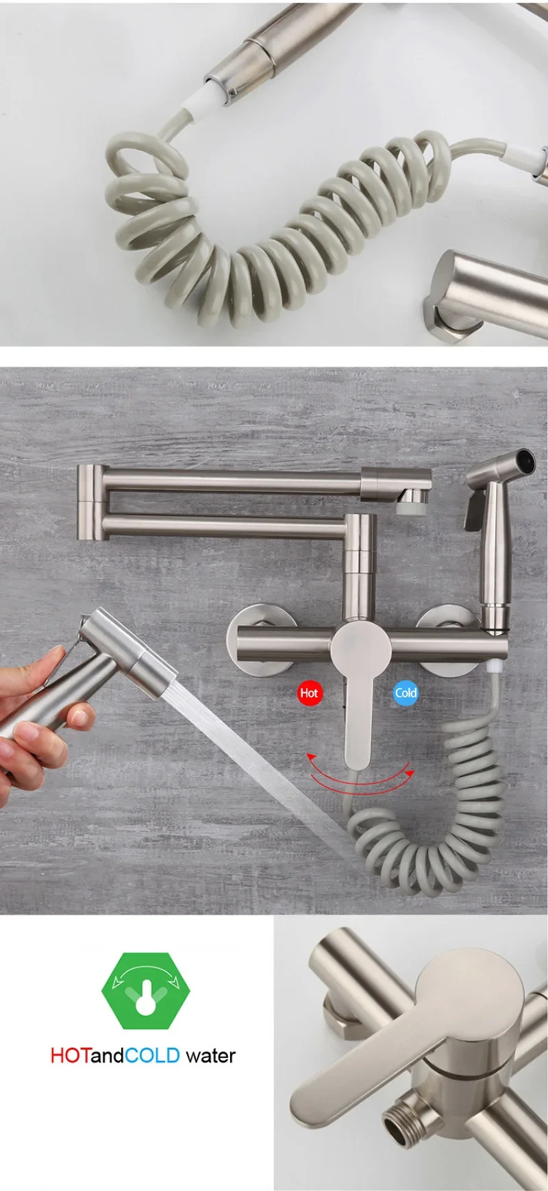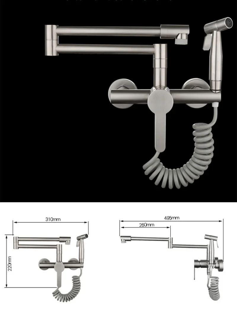 Kitchen Sink Faucet with Sprayer Gun Modern Pot Filler Faucet Single Handle Retractable Wall Mounted Folding Mixer Tap Swing Arm