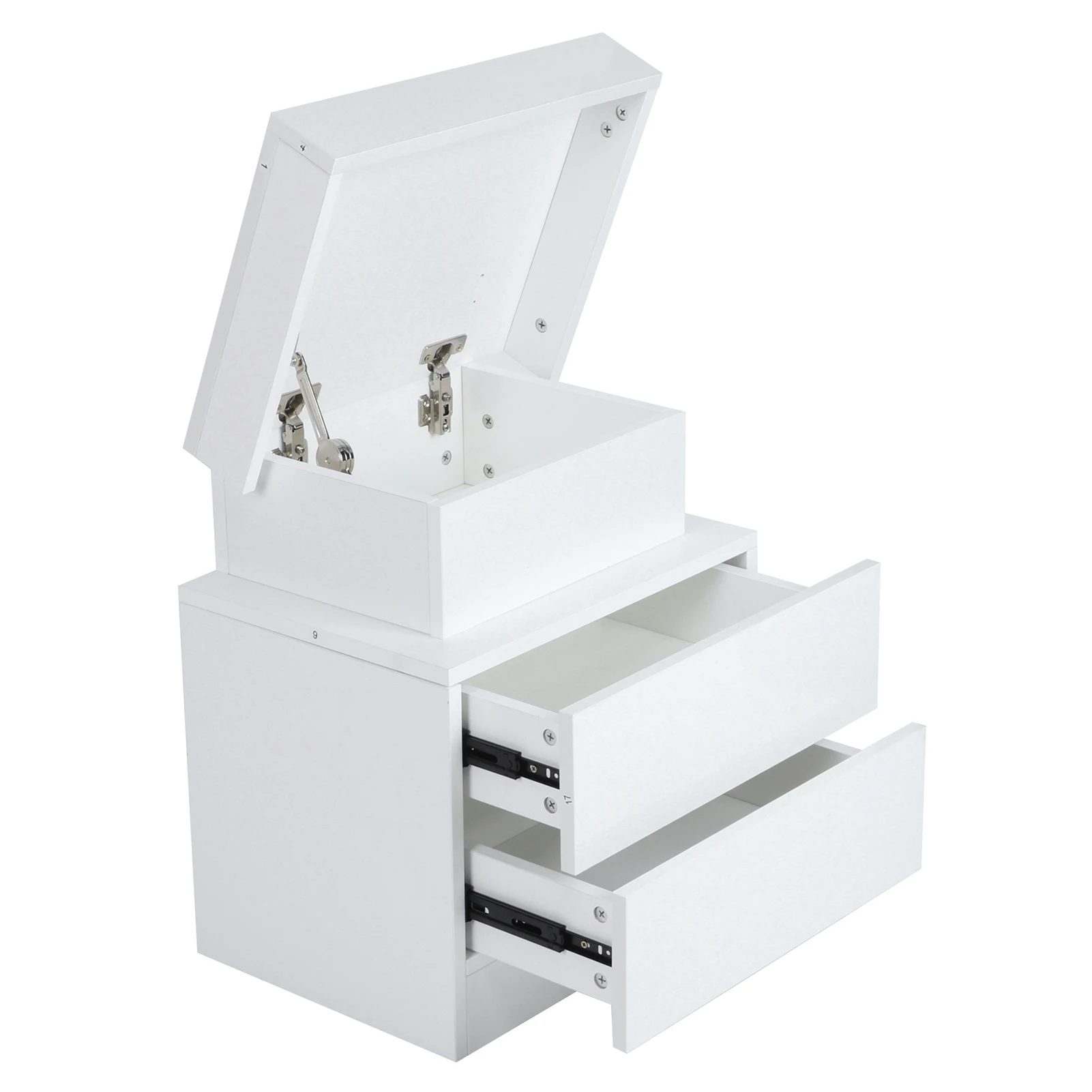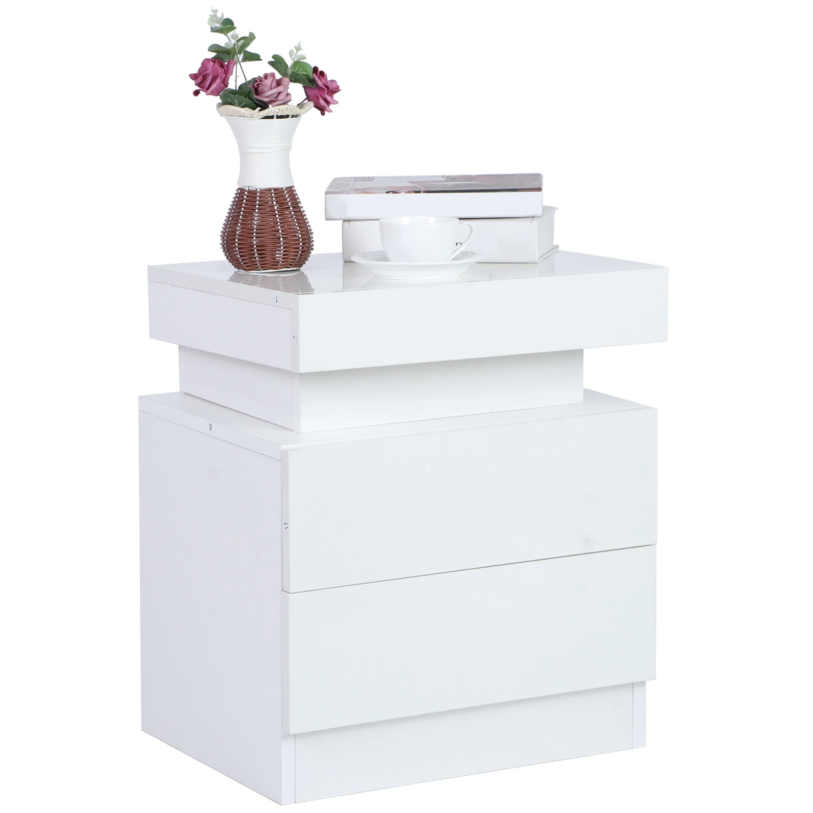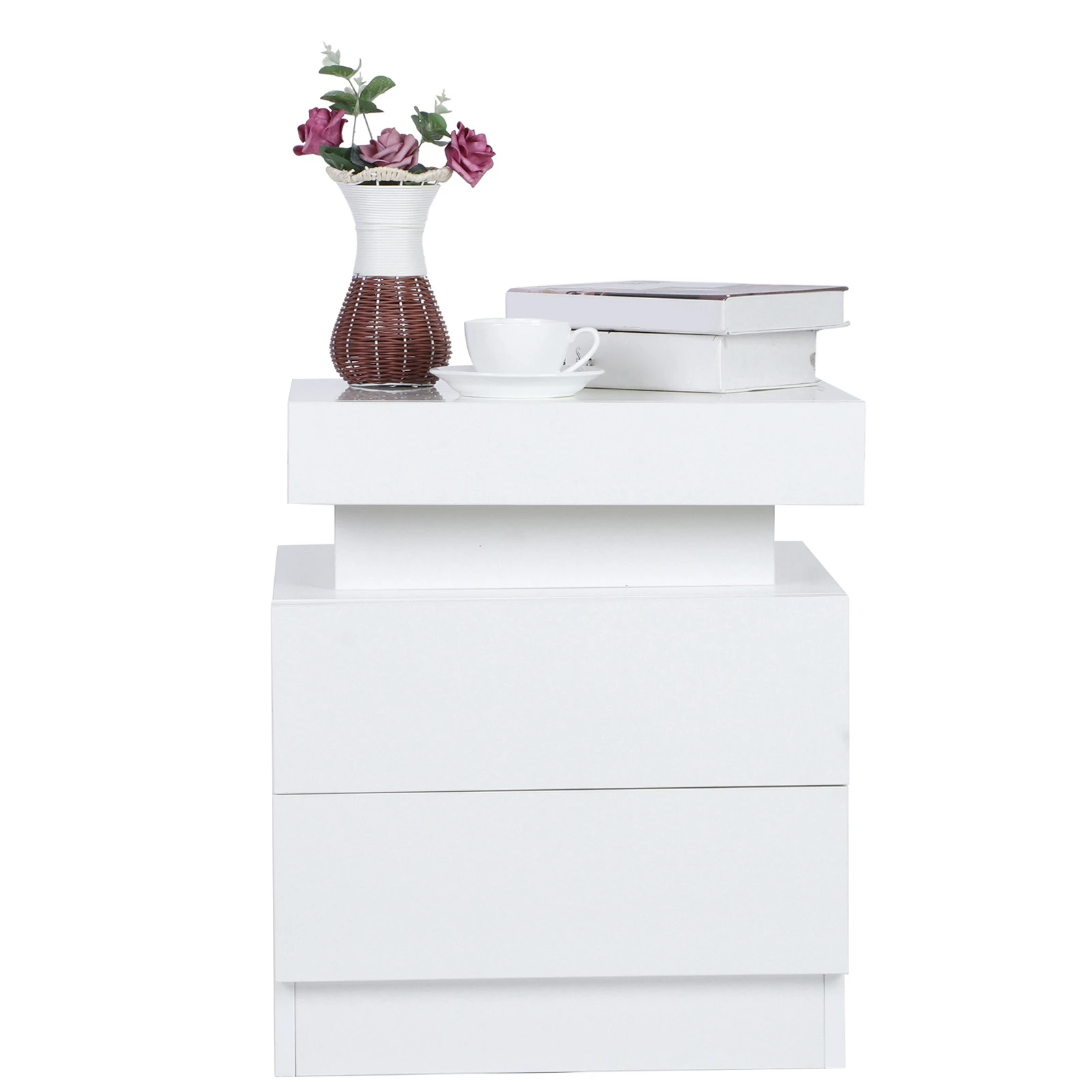 1. This bedside table is made of melamine chipboard material, and the drawer fronts with high gloss finish. The bedside unit can serve the weight capacity as high as 40kg.