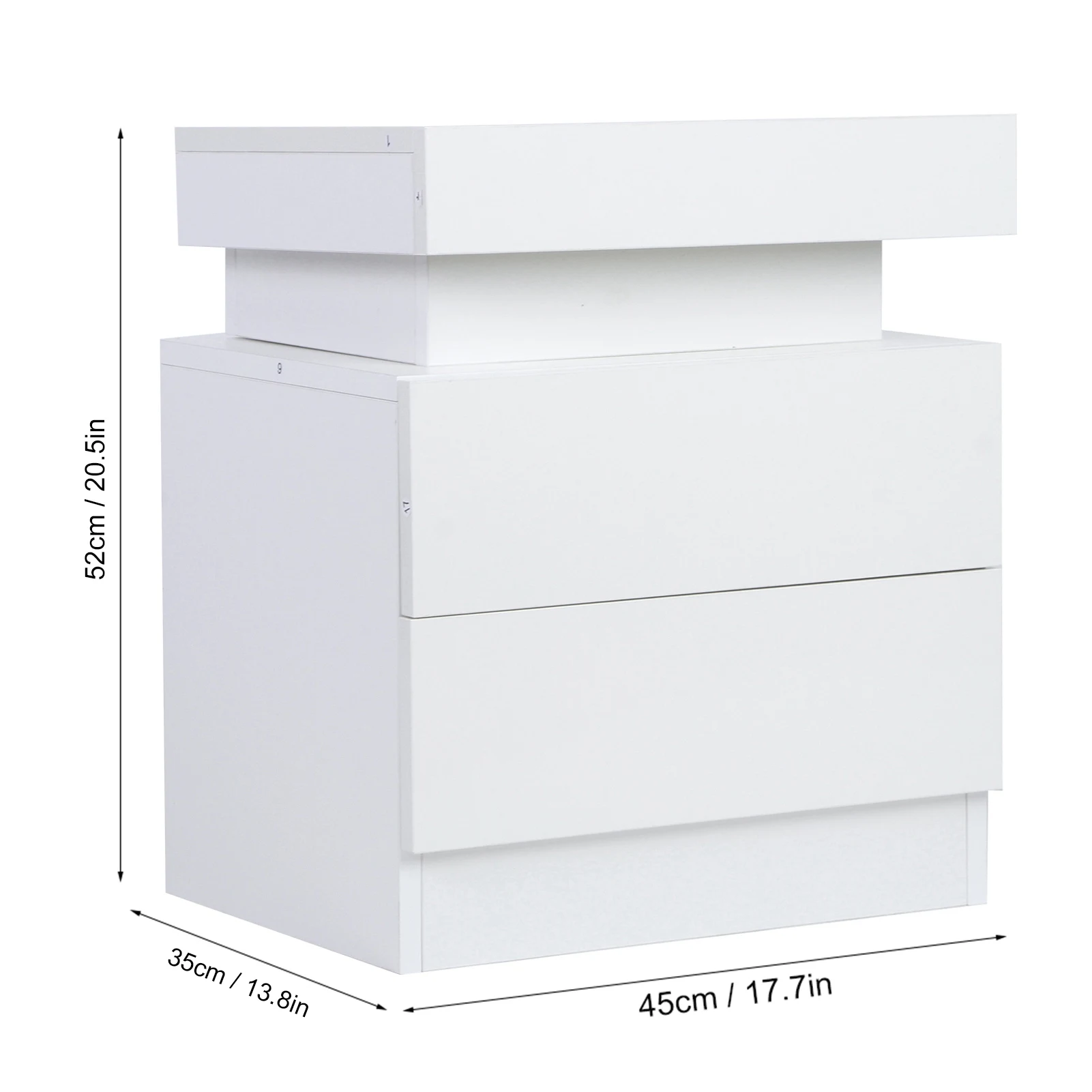 5. Spacious bedside cabinet, with dimension of 45x35x52CM, in white color and offering ample storage space in a stylish design.
