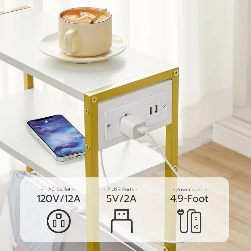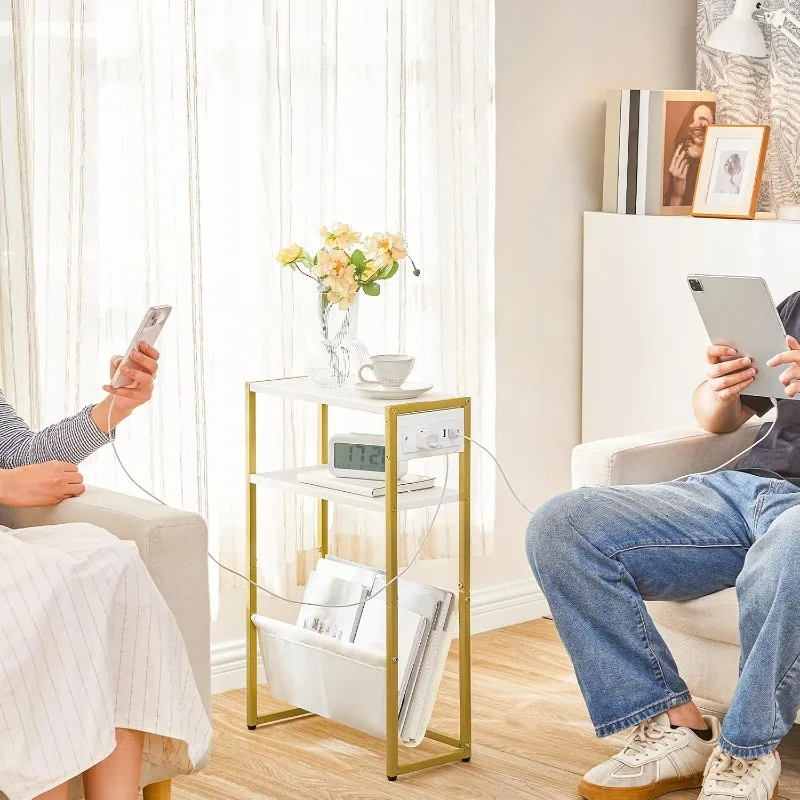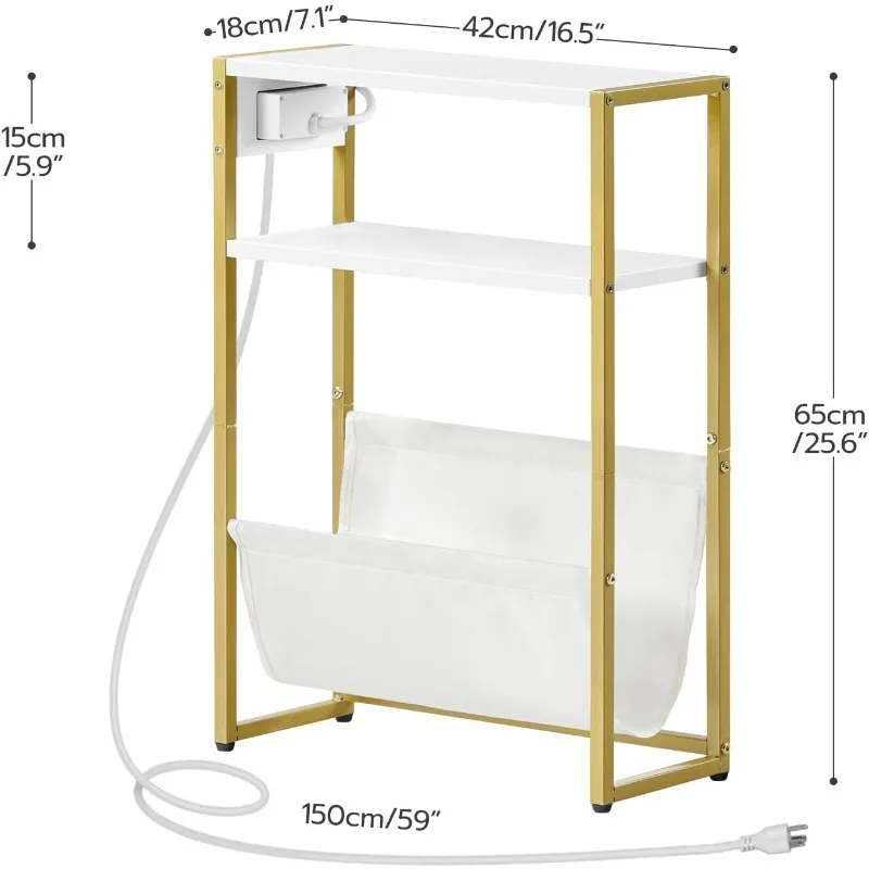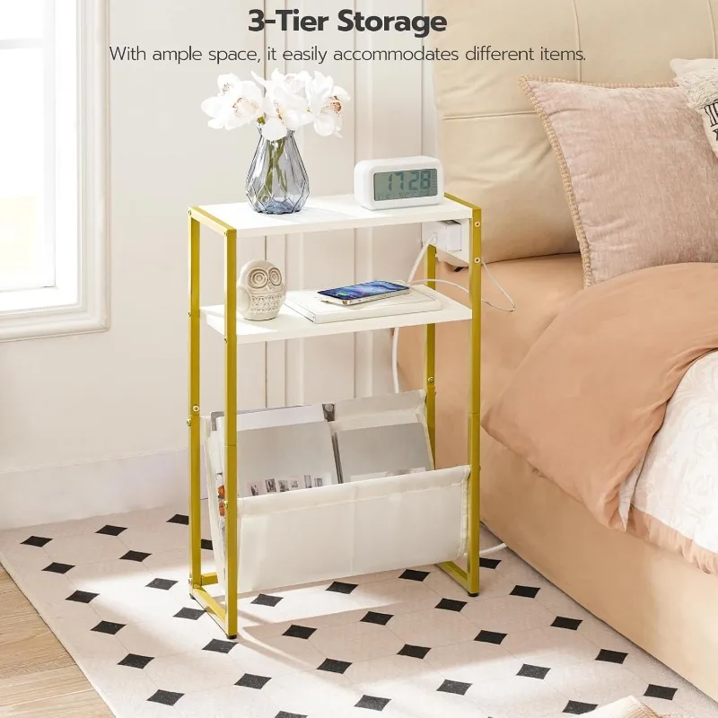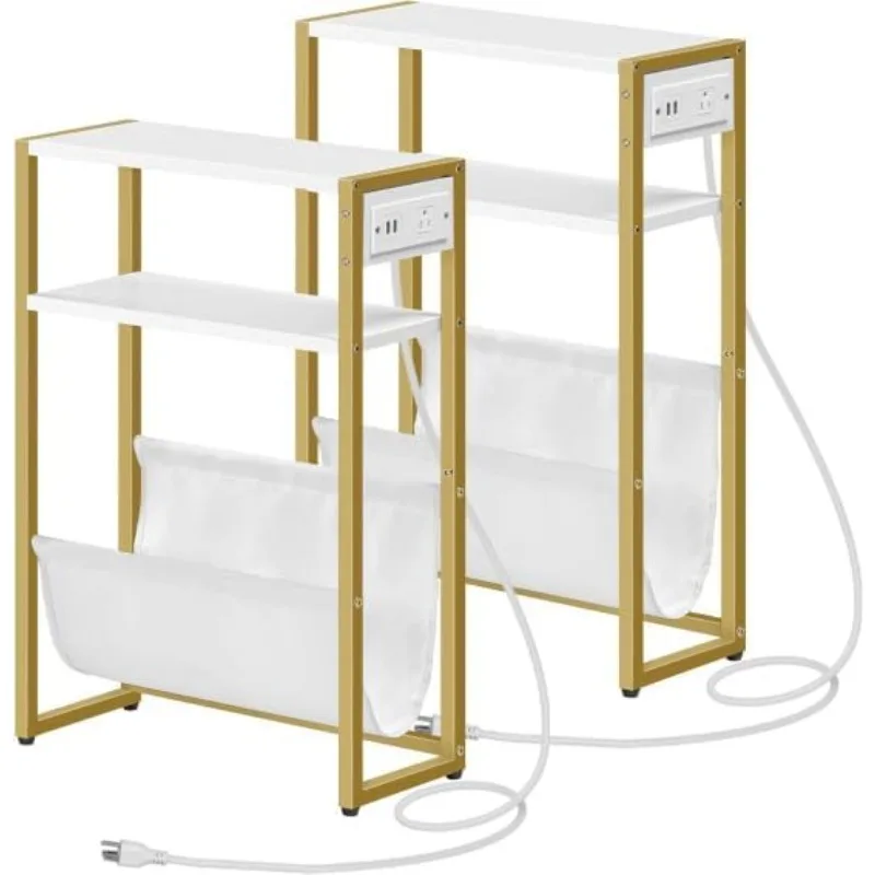Narrow Side Tables Set of 2, End Table with Charging Station, 3-Tier Nightstand, Bedside Table with Wooden Shelves and Magazine