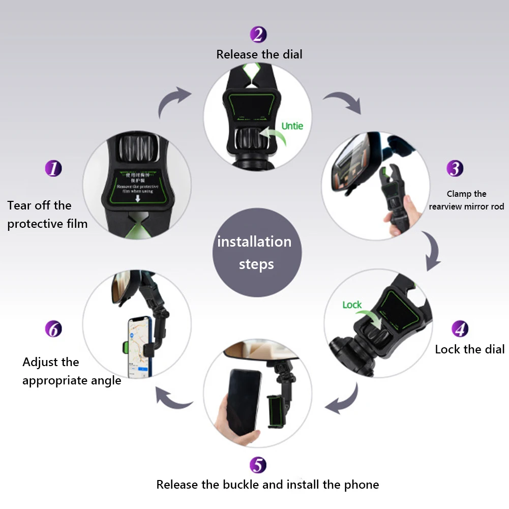 Feature: 1. It can rotate at 90 ° to give you a satisfactory angle to meet the needs of different lines of sight. 2. 360 ° supports horizontal and vertical screen switching, and the navigation angle can be adjusted at will, so that you can better plan the route and drive. 3. Large size and clamp; large clamping distance. 58-90mm adjustable width, suitable for most mobile phones on the market; 14-30mm clip width, clip wherever you want, super flexible 4. Super stable. The buckle is equipped with strong spring. Mobile phones with multiple screen sizes can't be thrown off 5. Easy to install. The second generation of new crab pliers design, fast locking. Save time and effort 6. One button telescopic, easy operation. Gently press the unlock key to extend the support instantly 7. Concealed design. When in use, just pull the bracket out of the rearview mirror; If you don't need it, you can gently push to hide the bracket behind the rearview mirror without disturbing your line of sight and ensure your driving safety. 8. Applicable to multiple functions and scenarios. A multifunctional mobile phone bracket with a wide range of applications can be used in car rearview mirrors, car pillows, kitchens, restaurants, bedrooms and even students' online classes. In short, it can be used where it can be clamped. Specification: Product color: Grey, Green (optional) Product material: ABS, silicone Applicable scenario: car, home Product character: second generation new bionic engineering design - crab clamp Usage: rearview mirror, desktop, bookshelf and chair back Scope of application: car mirror, car pillow, kitchen, dining room, bedroom Product size: 200 * 26mm/7.9x1in Product weight: 112g Product packaging: color box Color box size: 120x108x48mm/4.7x4.3x1.9in Single gross weight: 138g Installation steps: 1. Remove protective film 2. Release the dial 3. Clip in mirror lever 4. Lock the dial 5. Release the clip and install the mobile phone 6. Adjust the appropriate angle Note: Due to the different monitor and light effect, the actual color of the item might be slightly different from the color showed on the pictures. Thank you! Please allow 1-2cm measuring deviation due to manual measurement. ![]() 1 x Rearview Phone Holder