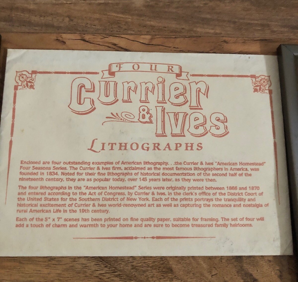 These beautiful art lithographs are a 4 set by Currier and Ives it’s vintage and they are all framed in immaculate shape and have the paper they came in confirming what they are each scene is different weather and a different setting love the 4 together not the easiest to find rare get these wonderful pieces for a great deal they are going for 75.00 on eBay but u did a great deal