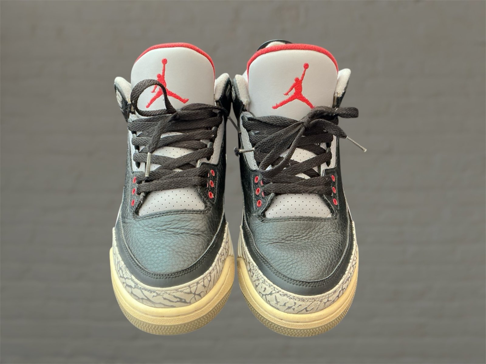 A classic pair of Air Jordan 3 “Black Cement,” featuring the iconic black tumbled leather upper, elephant print overlays, and red Jumpman logo on the tongue. This 2018 release stays true to the original 1988 design with its vintage-inspired midsole and timeless silhouette. Light signs of age and wear on the midsoles give these sneakers a natural, retro patina that enhances their authentic look.