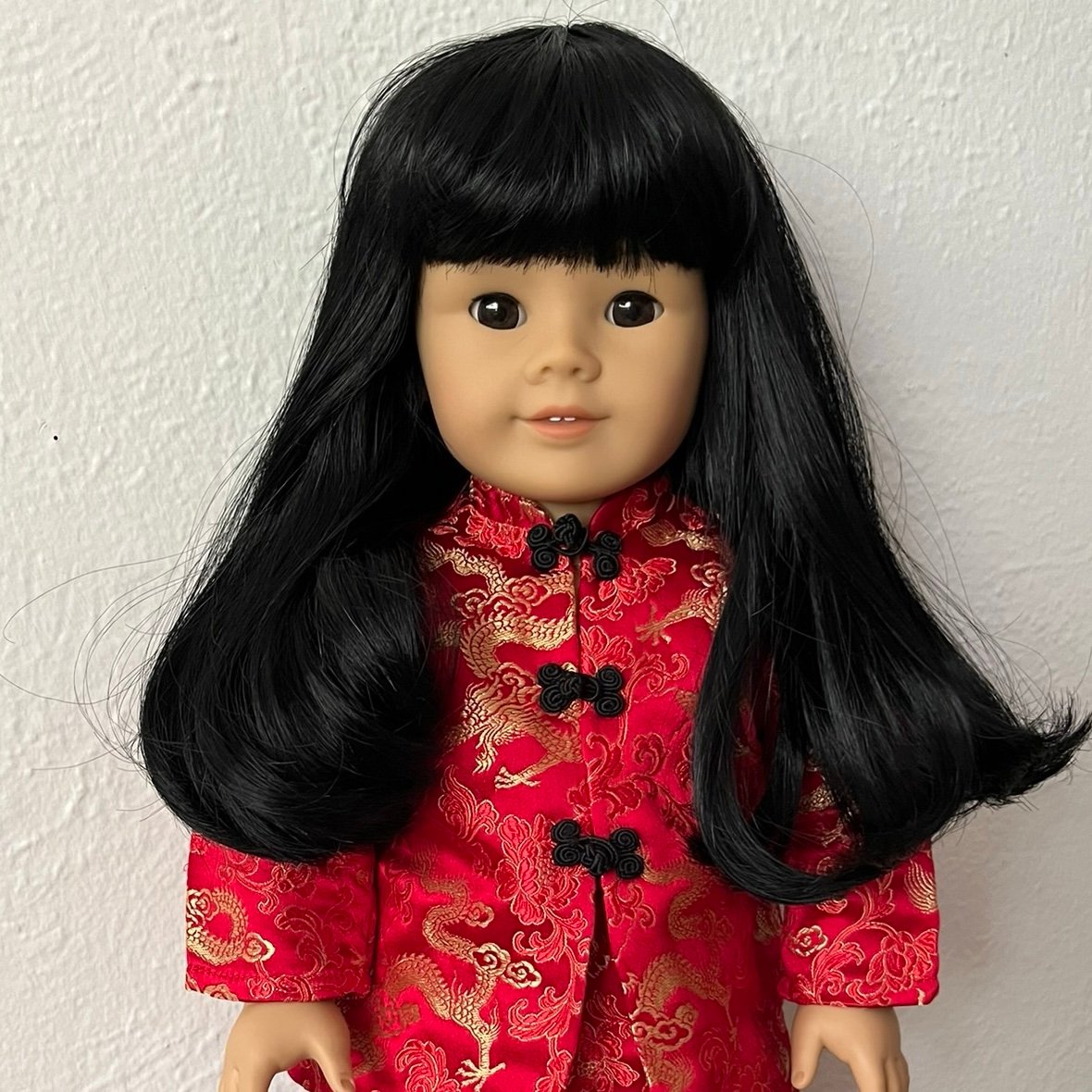 American Girl of Today/Just Like You 4. She is an older doll with a new head so she has the soft squishy limbs and a thicker torso. She has a few shine marks and marks on her limbs, please look at all the photos carefully. There is also a part of her torso that was stitched up at the doll hospital. Her face and hair though are basically brand new and she has been displayed or in storage since the head replacement. I will ship her in her doll hospital box for extra protection. She can come with her pleasant company Chinese New Year outfit (top and pants only, I don't have anything else from the set). Sorry but price is firm at this time.