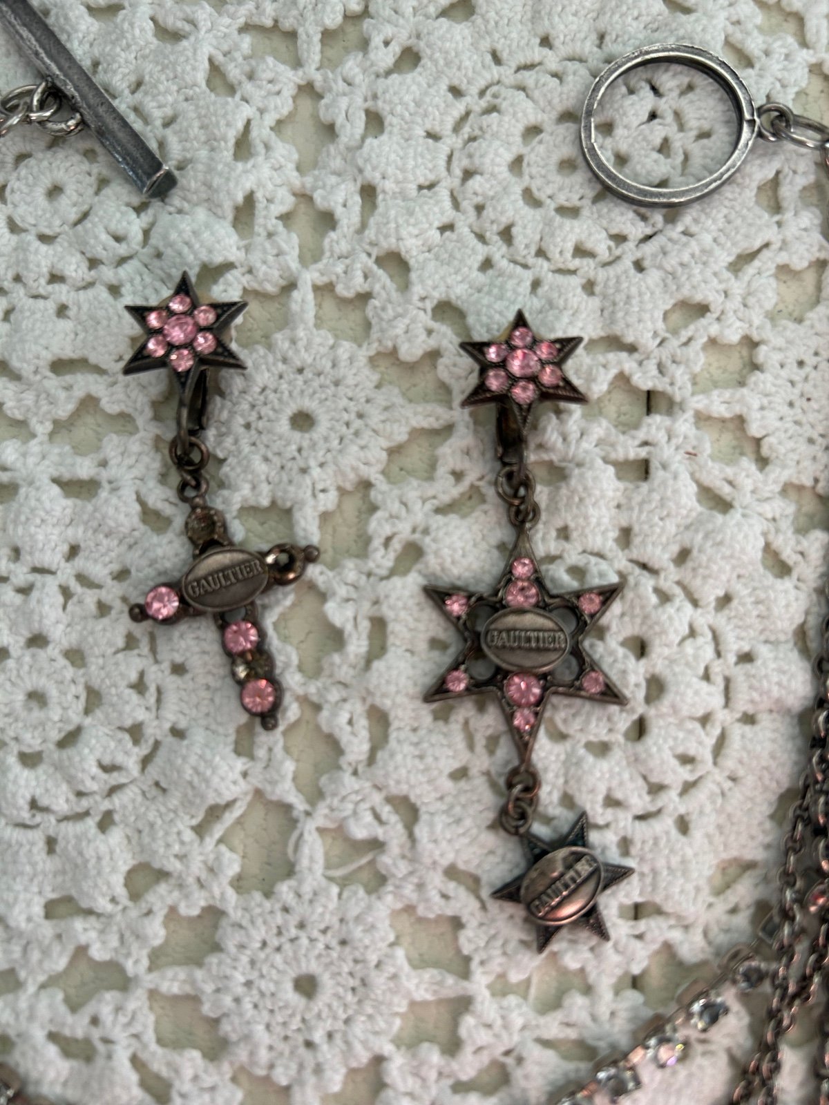 Purchased on a Paris trip around 1996. Two crystals are missing from the heart and one from the cross on the necklace. Two crystals are missing from the cross on one of the earrings and the back one of the earrings. The rubber piece has melted onto it. I’m sure it can be fixed. Stunning piece! I’m open to offers.