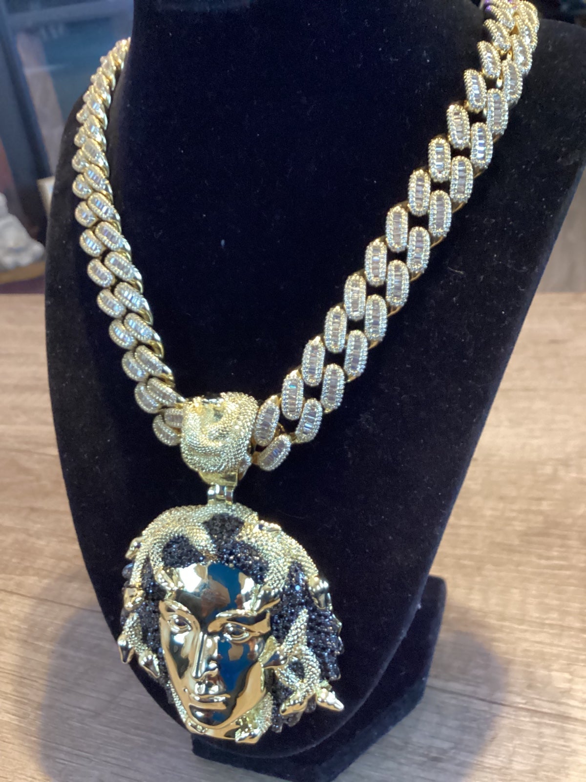 Product Description Handmade Mens 5A CZ Diamond Ice Out Famous Medusa 14K Gold Plated Chain and Pendant 17MM 22Inch Cuban Chain 100% Ice Out Stamp 14k Gold Plated Finish, so it will not TARNISH OR CHANGE COLOR PENDENT AND CHAIN We stand behind our product quality. Can be wearable on any occasion and attire. We have this pendant in White(Rhodium Finish) Gold Finish The pendant is made of 10.5 ct Diamonds (CZ) handmade micro paved Unique Handmade perfection for a real diamond pendant look. Satisfaction Guaranteed BIG CUBIAN CHAIN Please note that the color may be slightly different from photos, due to the difference in the monitor lighting 14k Gold Plated 5X Layered steel eletro plating with ecoating. The gold color choker Non Rust or Neck Green FAST SHIPPING I ONLY SELL EXCLUSIVE JEWELRY IF YOU WANT SOMETHING THAT I DO NOT HAVE I WILL GET IT FOR YOU! SHOOT ME A MESSAGE!