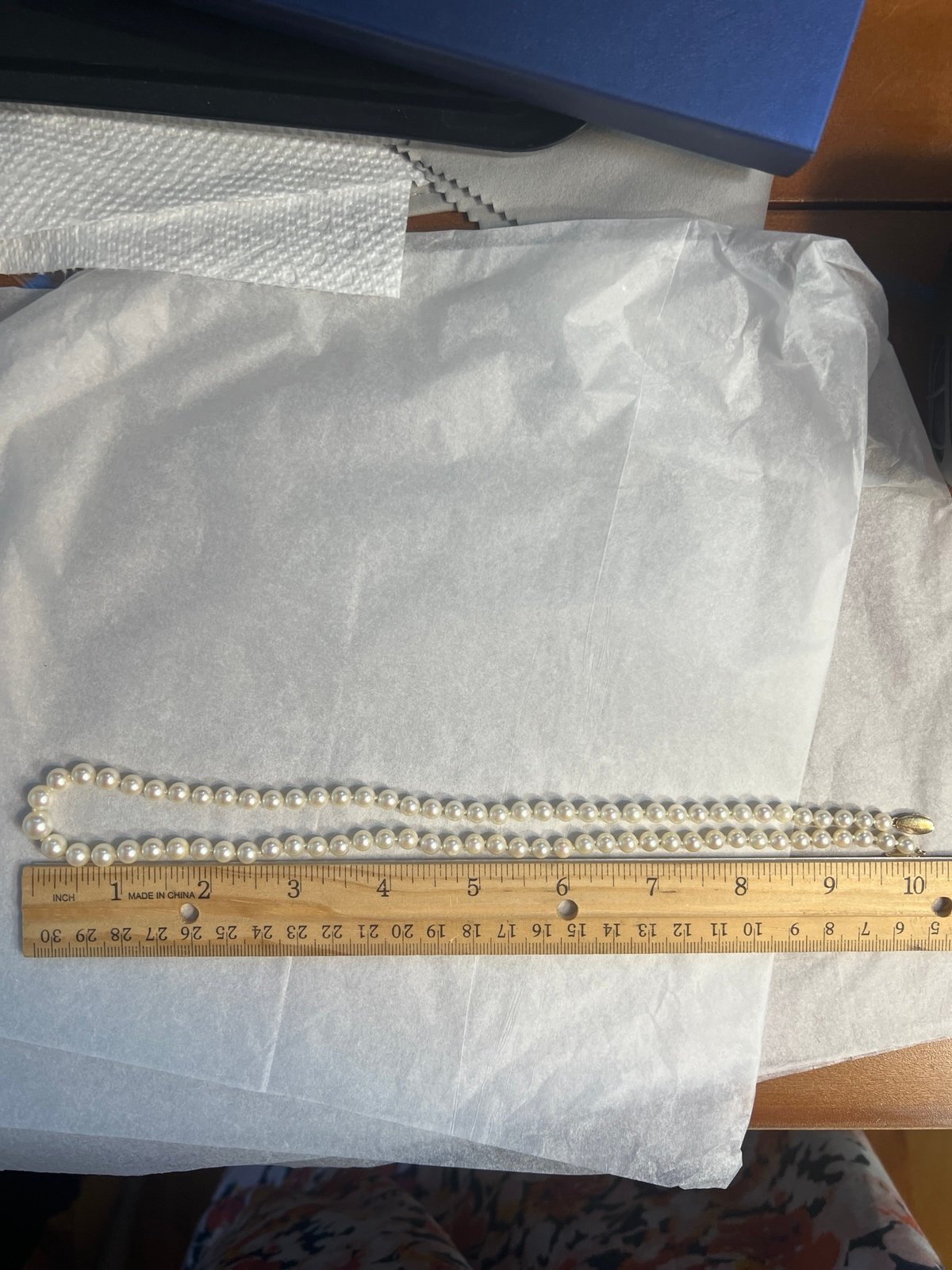 This is a beautiful classic strand of genuine Akoya saltwater cultured pearls. It is 20 inches long, and has a 14k secure clasp. The largest center pearl is 8.2 mm, the smallest next to the clasp is 4.7. They are a creamy white color with no blemishes visible to the naked eye. Can wear any time with anything, they add a nice glow. Shiny nacre, individually knotted. These cost 1000 when purchased 2 years ago, pearls have gotten more expensive since then.Only worn a couple of times.