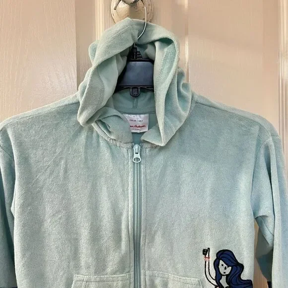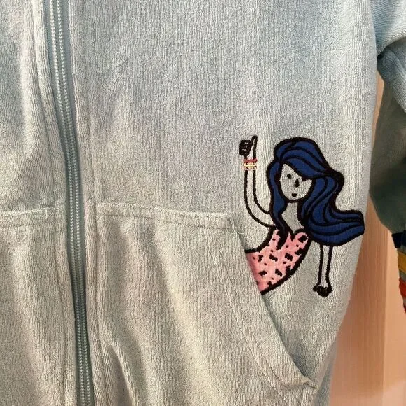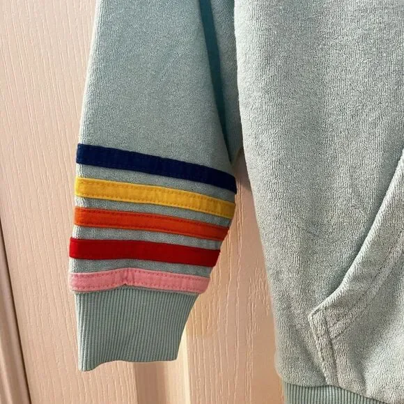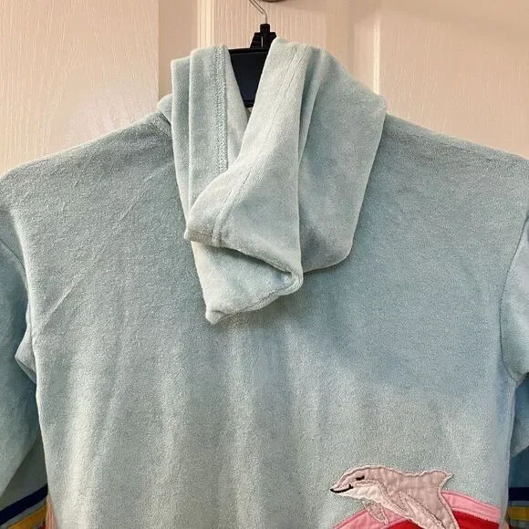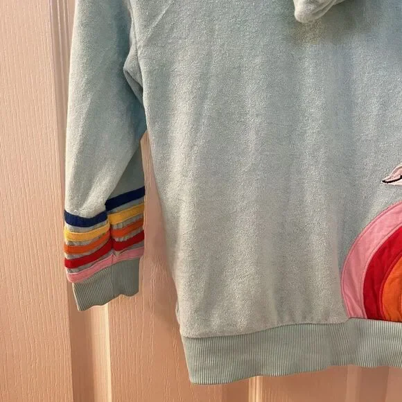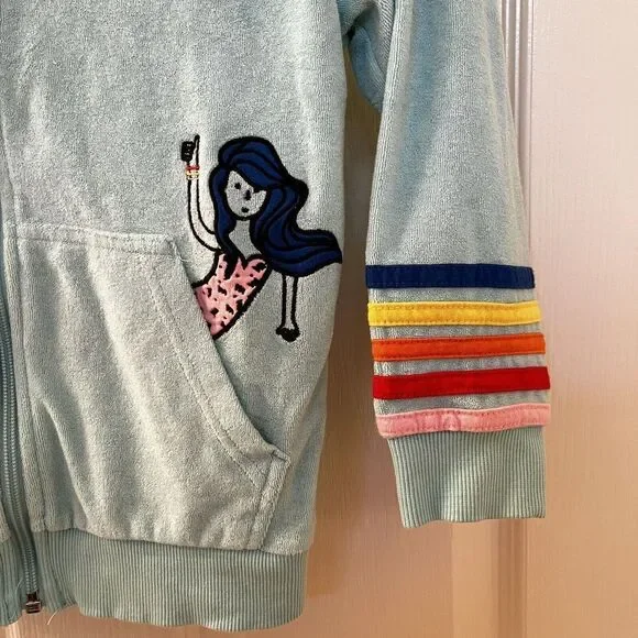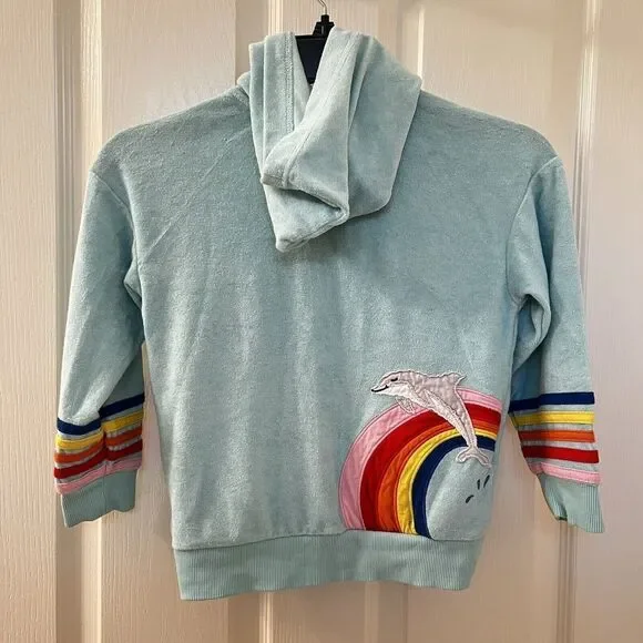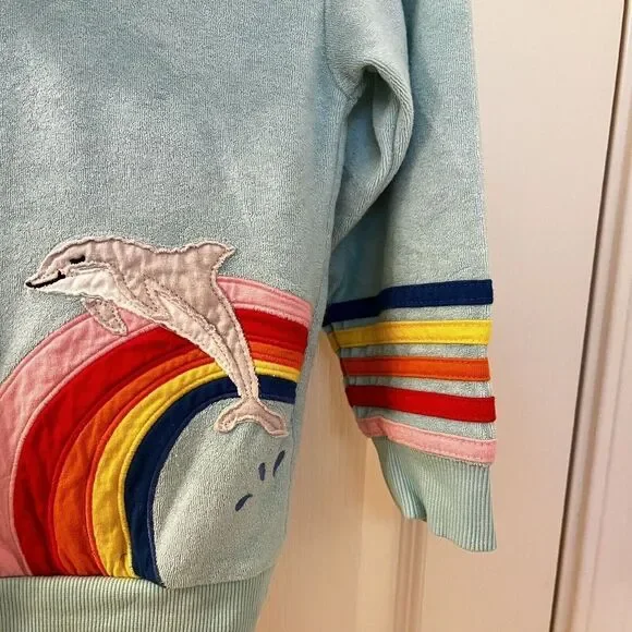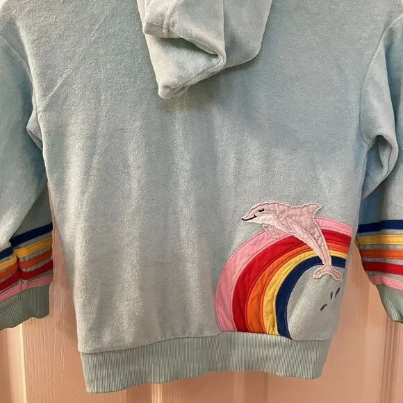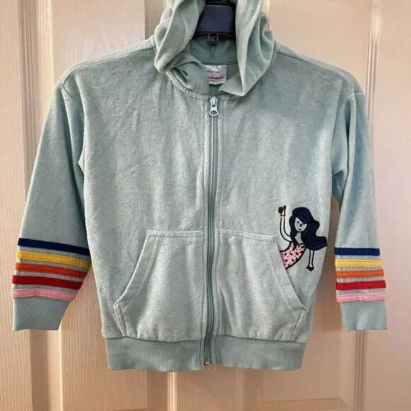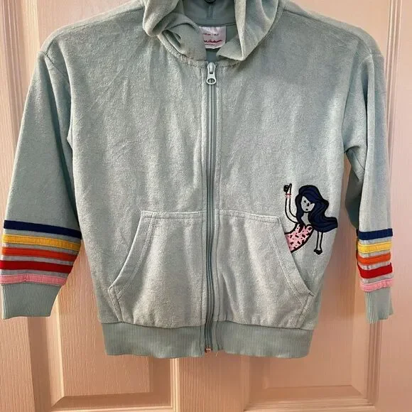 Hanna Andersson Mermaid Dolphin Rainbow Applique Terry Hoodie Girls Size 110 US 5. This full zip hoodie is so cute, I loved my daughter in it. Embroidered applique mermaid coming out of the front pocket with rainbow striped applique around the bottom of the sleeves and embroidered applique rainbow and dolphin on the back. Has been worn and washed, maybe some slight wash wear and some curling to the applique, but no major issues that I can find. Good Used Condition.Size: 110, US 5