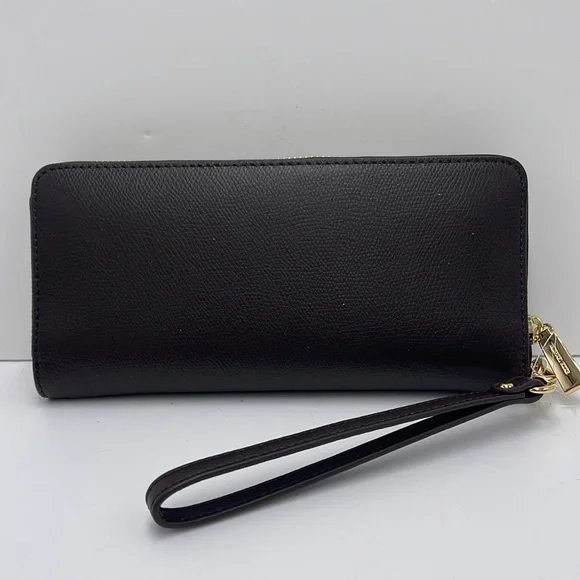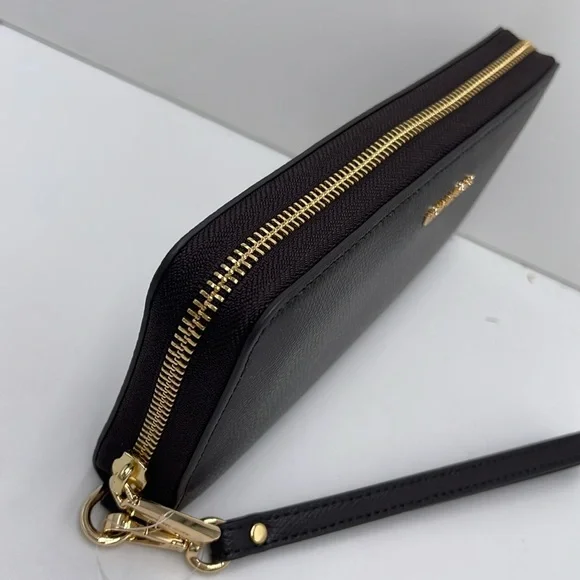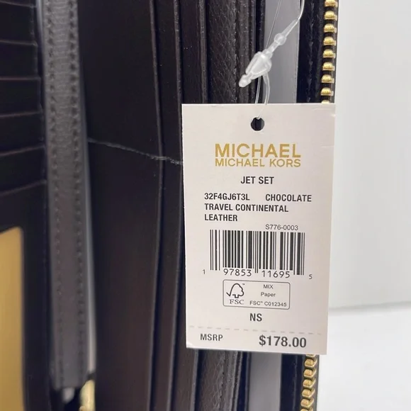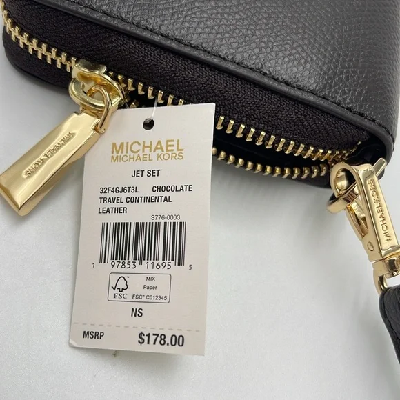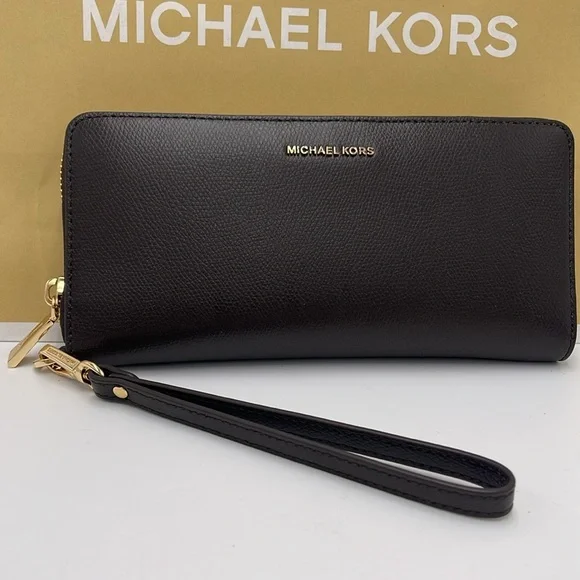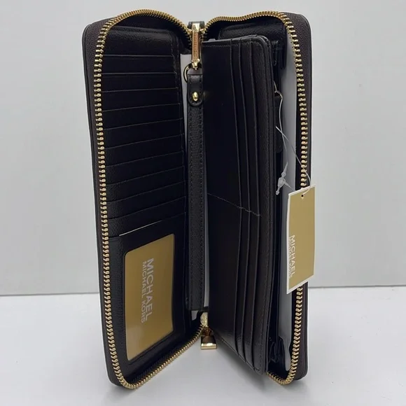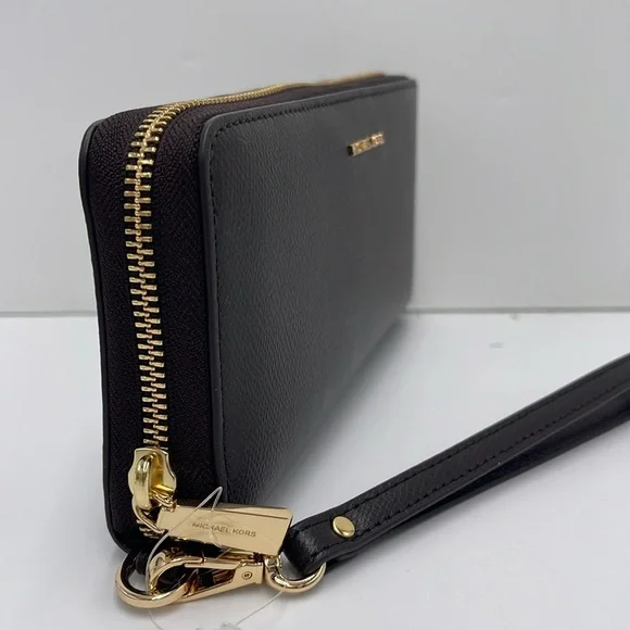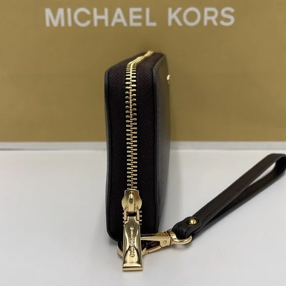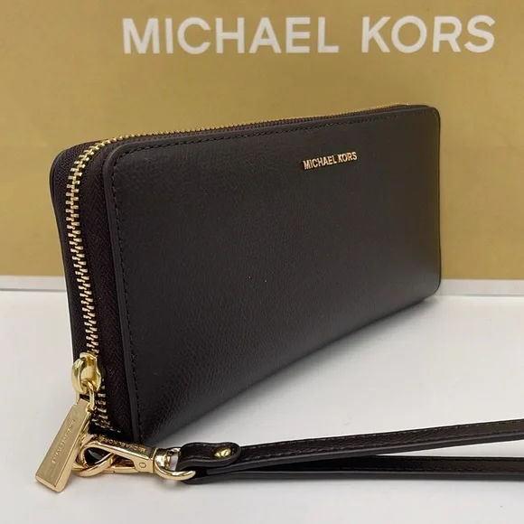 Sleek black wristlet wallet by Michael Kors. Features a gold logo and hardware.Michael Kors Jet Set Travel Large Leather Continental Wallet Wristlet Phone Holder Case Chocolate NWTAuthentic Crafted from textured leather, this sleek wallet is the perfect all-in-one accessory. It features a dedicated pocket for your phone and a wealth of card slots for easy organization. A must-have when traveling or commuting, it can easily be tucked into your carryall for everyday functionality.• 100% leather from tanneries meeting the highest standards of environmental performance• Wallet• Leather• 100% leather• Gold-tone hardware• 8.25"W x 4"H X 1"D• Interior details: zip pocket, 5 slip pockets, 17 card slots• Lining: 55% polyester/45% linen• Zip fastening• ImportedMICHAEL KORSJET SET32F4GJ6T3LCHOCOLATETRAVEL CONTINENTALLEATHER