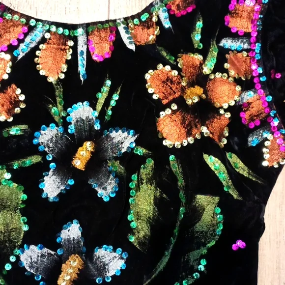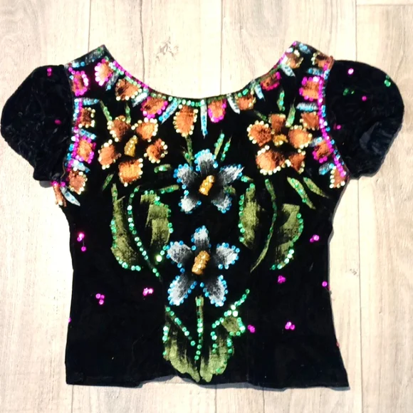 Hand Painted Circle Skirt Top Sequin Mexico shirt Size 6-8 (pit to pit 17") 1950s shirt is 16.5"Beautiful colorful hand painted and hand sequined full circle skirt and top made in Mexico.Colorful flowers hand painted on a black velvet background, decorated with hand sewn multi-color sequins.Short-sleeved blouse has no zipper and double dart bust-line.see my closet for matching skirt. Open to reasonable offers.