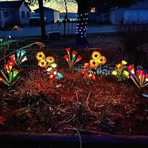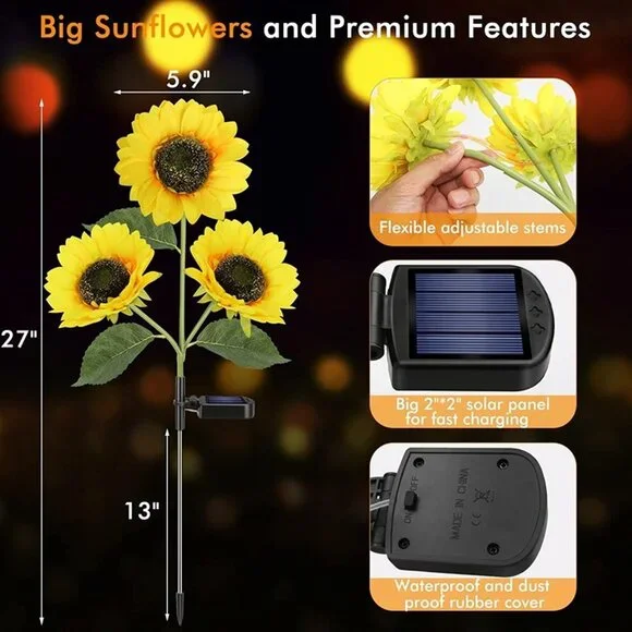Condition: BRAND NEW 800mAh Long Lasting Battery: The size of panel of solar flowers is 52*52mm, made by monocrystalline silicon, bigger panel for high efficiently absorbing solar and charging. Built-in 800mAh AAA large capacity Ni-MH battery, it takes 5 to 7 hours for charging and lasts 12 to 15 hours after full charge, more durable than ordinary solar flower lights.Life-like Impressive Flower: Meagoo solar flowers lights outdoor garden waterproof is made of silk fabric, no worry about rainy or snowy days, vivid petal, stamen and leaves of sunflower making it more realistic and natural looking when it's daytime. You can bend the flower stems and slightly adjust to what you want them!Bright and Warm: With 12 LEDs around each petal, these sunflowers outdoor decor are very bright at night, creating a warm and bright atmosphere at night while looks great even on overcast days or gloomy winter. Beautiful addition to the yard, brighten up flower garden, put by camping trailer, outdoor evening Fall decor