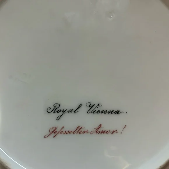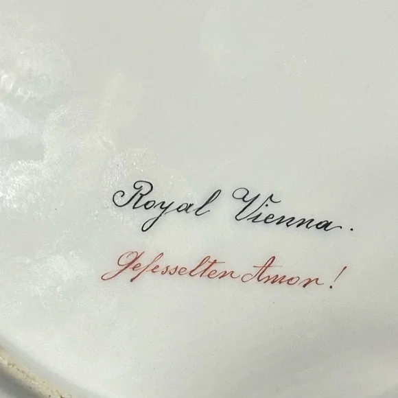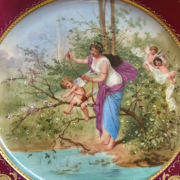 Really pretty late approx 9.5” around.Neo-classical scene hand painted on porcelain.I looked up the term “gefesselten amor” & it translated to bound Cupid or fettered Cupid.The hand painted picture on the plate depicts a woman mending an angels wings. According to the definition it’s probably a Cupid lol!Plate has no chips, cracks, or fading.Please let me know if you have any questions. Thank you for looking and sharing.  reasonable offers always considered.
