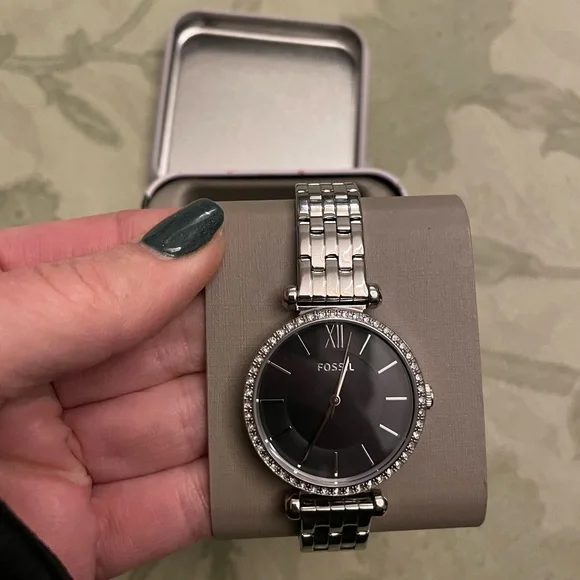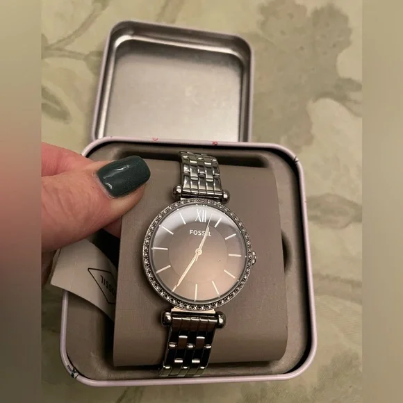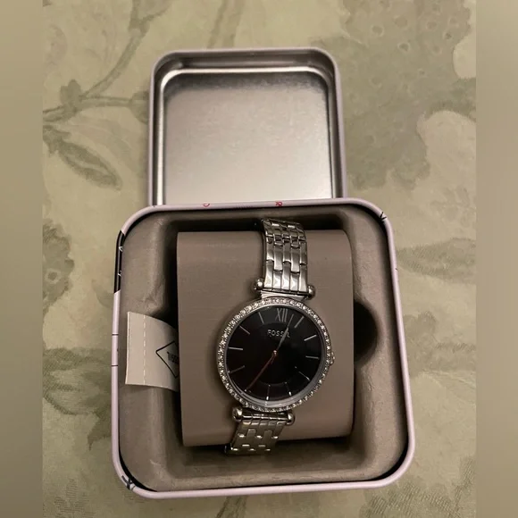 Fossil Analog Dial WatchClear white Rhinestone Details On this gorgeous Stainless Steel Watch NWT brand new with tags - as isThere are no spare hinges or warranty book with this oneThis is a classy elegant style perfect for everyday wear or a special occasion. Beautifully made Model BQ3496Japan movement Strap China Water resistant: 5ATM251904It has the original new plastic on back of face & also on clasp opener where the Fossil word is - see images Strap width: 14MMThis face is larger but not the largest I have @ 1 1/4” Wide Measurement in photos Comes in Festive Christmas Holiday Tin which shows numbers 1 - 12 on top of lidAround the lid sides it shows: humbug; ornament; Christmas tree; stars; here for the cheer; oh Ho Ho; presents gifts; branches; cake; candle; dashing; jingle jangle; egg nog carton; gingerbread oh snap; bows; fun; spirit; lamb fleece navidadHost pick for the Beat in Jewelry & Accessories Posh party thanks to @acoastalchicAnother great closet to shop! Reasonable offers welcome Bundle 2+ items to save more $Not on ? Sign up with my code 4BETTERGUDS & get $10KW women woman ladies girls misses guys men boys male unisex trans asexual upscale accessories luxury classy preppy stocking Christmas Xmas Gift Presents Santa Reindeer 🏡🚭F25